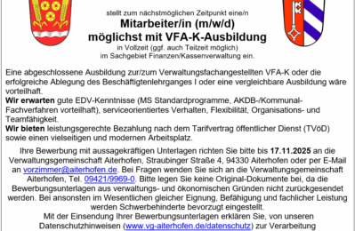Auszubildender oder Beamtenanwärter (m/w/d) gesucht Verwaltungsgemeinschaft Aiterhofen (ca. 6.300 Einwohner)-Mitgliedsgemeinden Aiterhofen und Salching- Wir schaffen zusätzliche Ausbildungsplätze und bilden zum 01. September 2026 aus: Auszubildende/r… weiterlesen