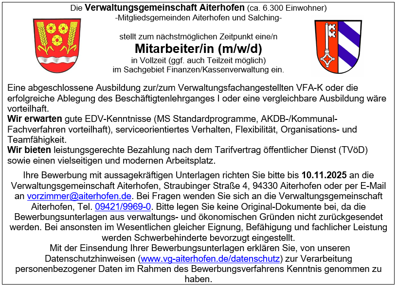 Ihre Bewerbung mit aussagekräftigen Unterlagen richten Sie bitte bis 10.11.2025 an die Verwaltungsgemeinschaft Aiterhofen, Straubinger Straße 4, 94330 Aiterhofen oder per E-Mail an vorzimmer@aiterhofen.de. Bei Fragen wenden Sie sich an die Verwaltungsgemeinschaft Aiterhofen, Tel. 09421/9969-0.